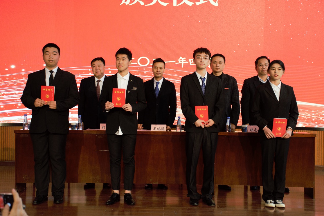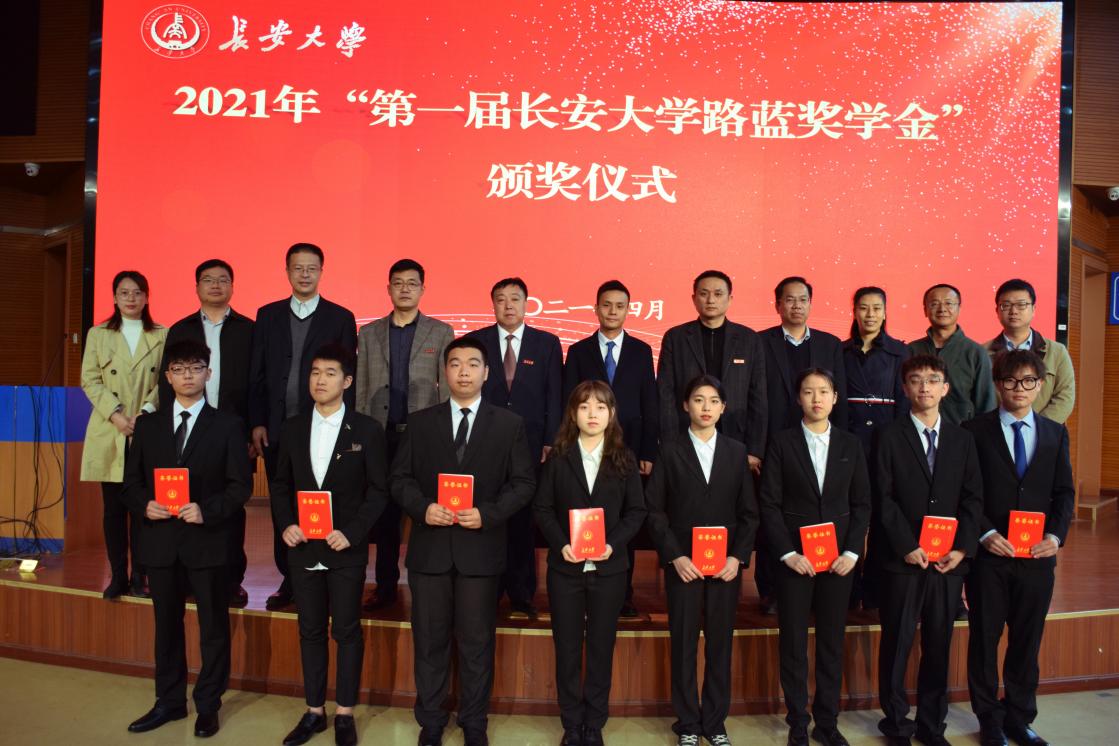 欧阳韬宣读2021年“第一届长安大学路蓝奖学金”获奖学生名单。与会领导嘉宾为获奖学生颁发荣誉证书。刘明和为奚林通颁发捐赠证书。