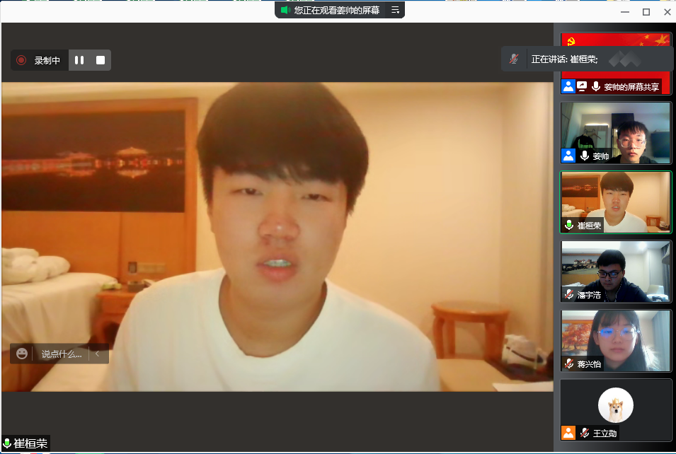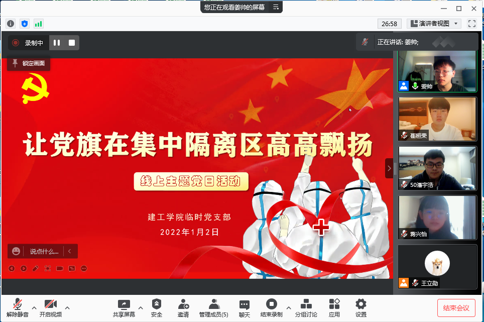 2022年1月1日,建工巴黎人娱乐城 党委决定在汉庭优佳酒店隔离的学生党员中成立建工巴黎人娱乐城 隔离区临时党支部。1月2日建工巴黎人娱乐城 隔离区临时党支部全体党员相聚云端,召开了一次特殊的线上主题党日活动。活动通过腾讯会议召开,由临时党支部书记姜帅主持,支部成员崔桓荣、蒋兴怡、潘宇浩参加了活动。