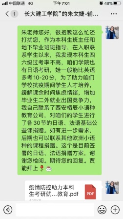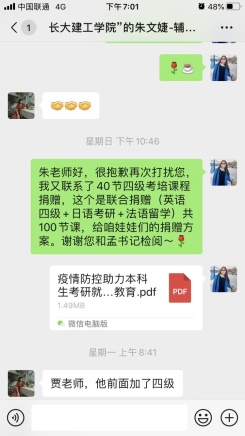 建工巴黎人娱乐城 民盟盟员贾能老师利用自身留法十年的学习和工作优势,积极联系西安澎博英语、栖辰小语种教育等校外培训机构,进行本科生英语四级和日语考研等线上课程的捐赠:含40课时(20)的免费大学四级课程,30课时的日语及30课时的法语免费课程,共计100课时。旨在引导巴黎人娱乐城 学生有效利用疫情封控期间的闲暇时光,以良好的心态打赢这场防疫攻坚战,增强学生的外语就业竞争力,提升学生综合能力。本次捐赠课程将帮助巴黎人娱乐城 学生积极渡过封控难关,借助趣味性的外语学习缓解因疫情而产生的心理问题和情绪困扰,适时调整心理状态,缓解心理压力,提高学习效率,助力人才培养,共同守护美丽校园!