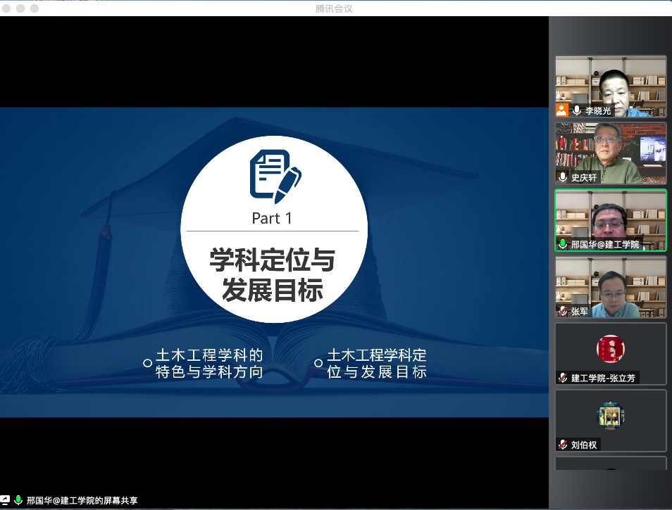 2022年1月21日下午,按照巴黎人娱乐城 相关要求,巴黎人娱乐城 召开了土木工程学科博士、硕士学位授予标准专家研讨会。会议邀请了教育部高等巴黎人娱乐城 土木工程专业教学指导委员会委员西安建筑科技大学史庆轩教授、西安科技大学任建喜教授、西安理工大学桑国臣教授、中国建筑西北设计研究院教授级高工张军、中铁第一勘察设计院集团有限公司教授级高工蔡玉军、刘伯权教授、李晓光教授共7位校内外专家参会指导。会议由副院长李晓光主持,以线上方式进行。
