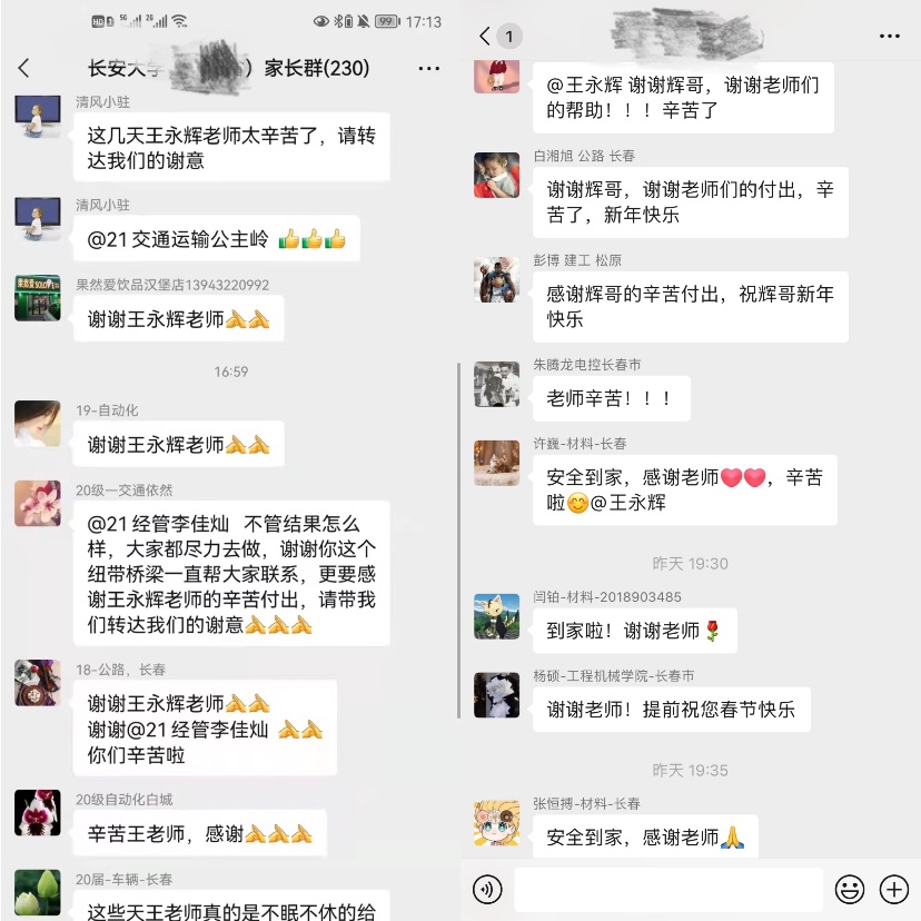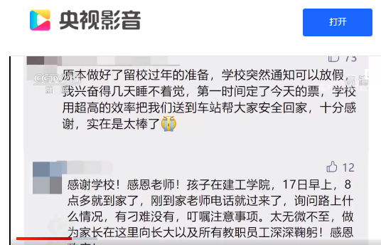 1月22日,央视《焦点访谈》节目以“‘疏’‘堵’结合保春运”为题播出了巴黎人娱乐城 为保障学生安全返乡做出的努力。巴黎人娱乐城 学生家长在节目下面留言:“感谢巴黎人娱乐城 !感谢老师!孩子在建工巴黎人娱乐城 ,17日早上8点多就到家了,刚到家接到老师电话,询问路上什么情况,有刁难没有,叮嘱注意事项,太无微不至,作为家长在这里向长大以及所有教职工深深鞠躬!感谢!”相信这位家长的一番话是所有家长心情的缩影,也是对所有为学生返乡做出贡献的老师最大的鼓励。