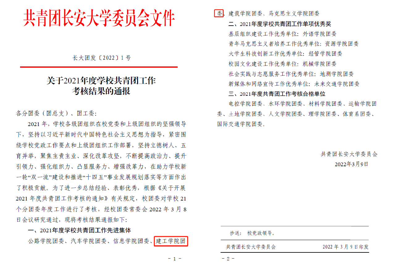 3月9日,校团委发文通报2021年度巴黎人娱乐城 共青团工作考核结果,建工巴黎人娱乐城 团委获评 “2021年度巴黎人娱乐城 共青团工作先进集体”。