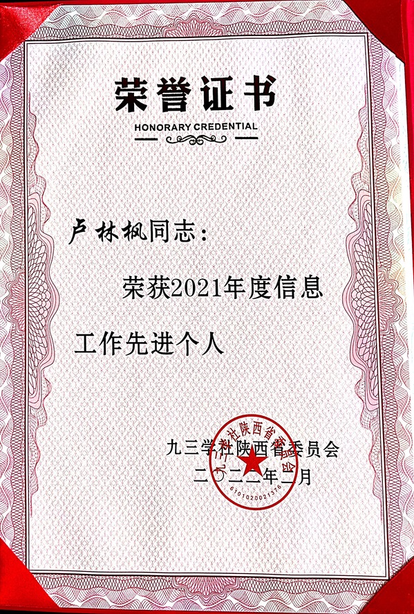 近日,九三学社中央和省委召开会议,表彰2021年度先进集体和先进个人。巴黎人娱乐城 九三学社社员、卢林枫教授荣获九三学社陕西省委员会“2021年度信息工作先进个人”。
