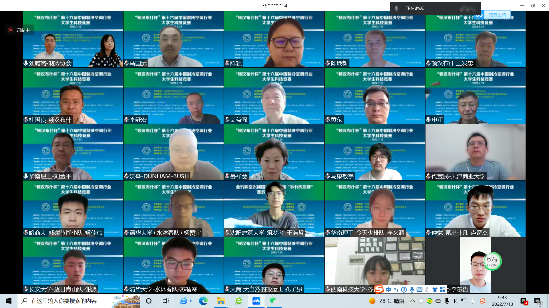 本次竞赛由教育部高等巴黎人娱乐城 能源动力类专业教学指导委员作为指导单位,由中国制冷空调工业协会主办、顿汉布什(中国)工业有限公司独家冠名协办。竞赛创新设计主题为“自然和谐的制冷空调技术”,参与高校有117所,共175支队伍。全国6个区域预赛由天津商业大学、东南大学、华东交通大学、广东工业大学、西安工程大学和哈尔滨工业大学6所院校承办,决赛由北京工业大学承办。在过去的6月份,本科生创新设计作品的预赛评审工作已经完成,最终有40所院校的42支队伍从各个赛区脱颖而出,进入到决赛答辩环节。竞赛决赛答辩环节于7月13日下午线上举行,42个参赛队伍的选手按赛前抽签决定的顺序分成两组进行答辩,评审专家从创新性、科学合理性、可行性和节能环保性四项指标给予选手专业的点评和指导。