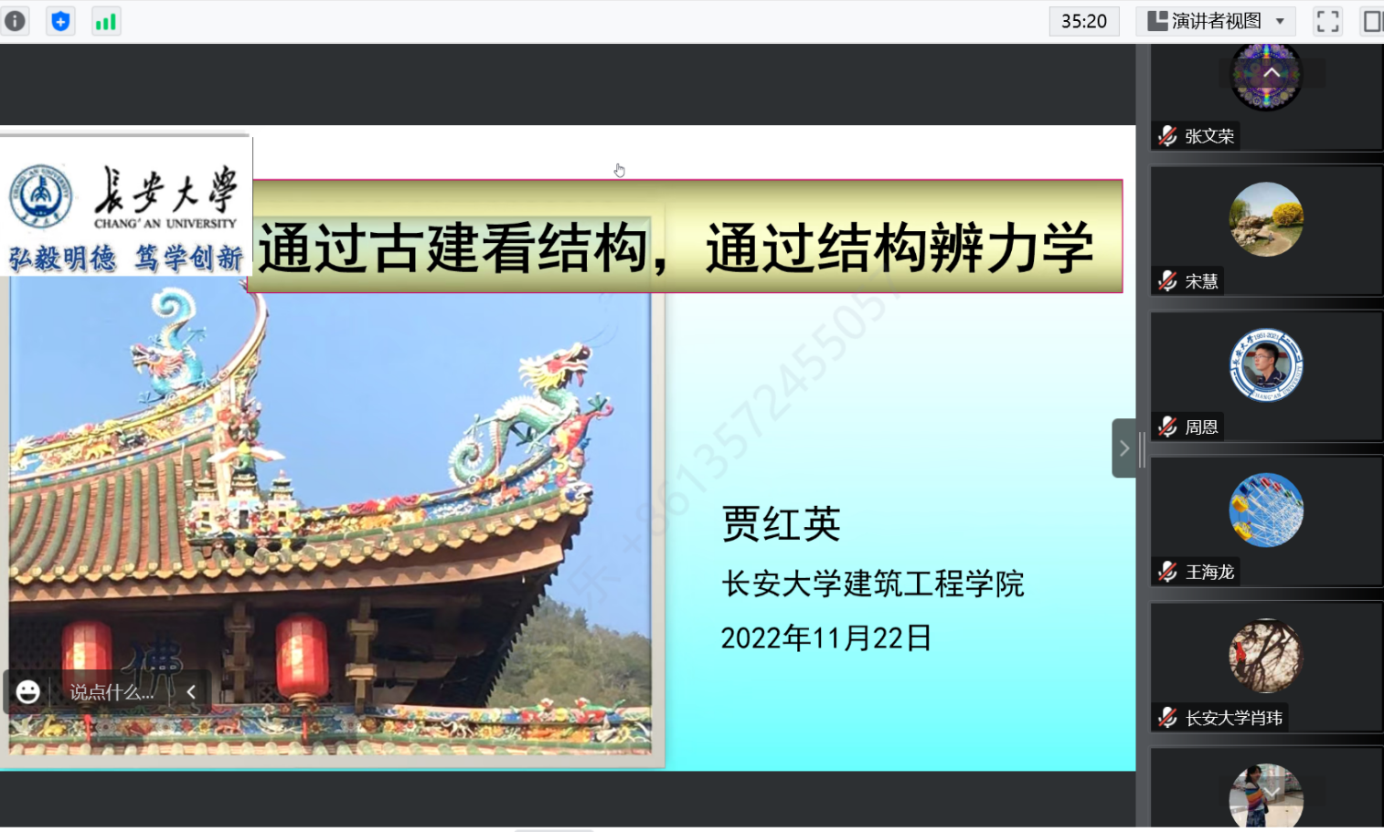 贾红英以中华古建筑为载体,探究其符合客观规律结构的力学逻辑,借斗拱结构柔中有刚、力与造型高度统一的设计理念,结合课本知识与工程减震实例,辨析结构力学动力分析知识点,以此培养学生以力学思想,观察、分析、处理工程问题的能力。最后,贾红英分享了教学思考交流,她认为课堂不是流水的教案和讲述,要有心智互动和思想的交流,要在潜移默化中建立文化自信、弘扬工匠精神、追求创新。