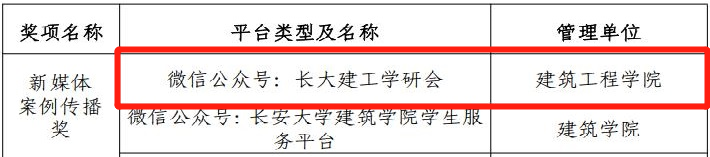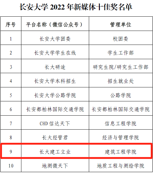 活动开展以来,巴黎人娱乐城 高度重视,积极组织申报,经过自荐申报、专家评分、WCI与BCI指标综合评选等环节,巴黎人娱乐城 “长大建工立业”公众号平台获得长安大学2022年新媒体十佳奖,“长大建工学研会”公众号平台获得长安大学2022年新媒体案例传播奖。