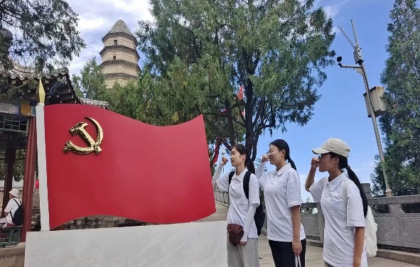 抵达延安后,实践队攀登宝塔山、凤凰山,在学思践行中追寻红色记忆;参观王家坪、杨家岭、枣园革命旧址,在老一代中央领导人生活工作的地方,追溯革命历史,学习优良作风,体悟伟大革命精神。在四八烈士陵园内,全体队员通过纪念塔前默哀鞠躬、陵台前献花、清扫墓碑、党徽前重温入党誓词等形式,表达对革命先烈们深切的追思。在中共中央西北局旧址内,队员们深入了解革命先辈的动人事迹与丰功伟业,学习党史知识,从中汲取精神力量,坚定青年一代的使命担当。