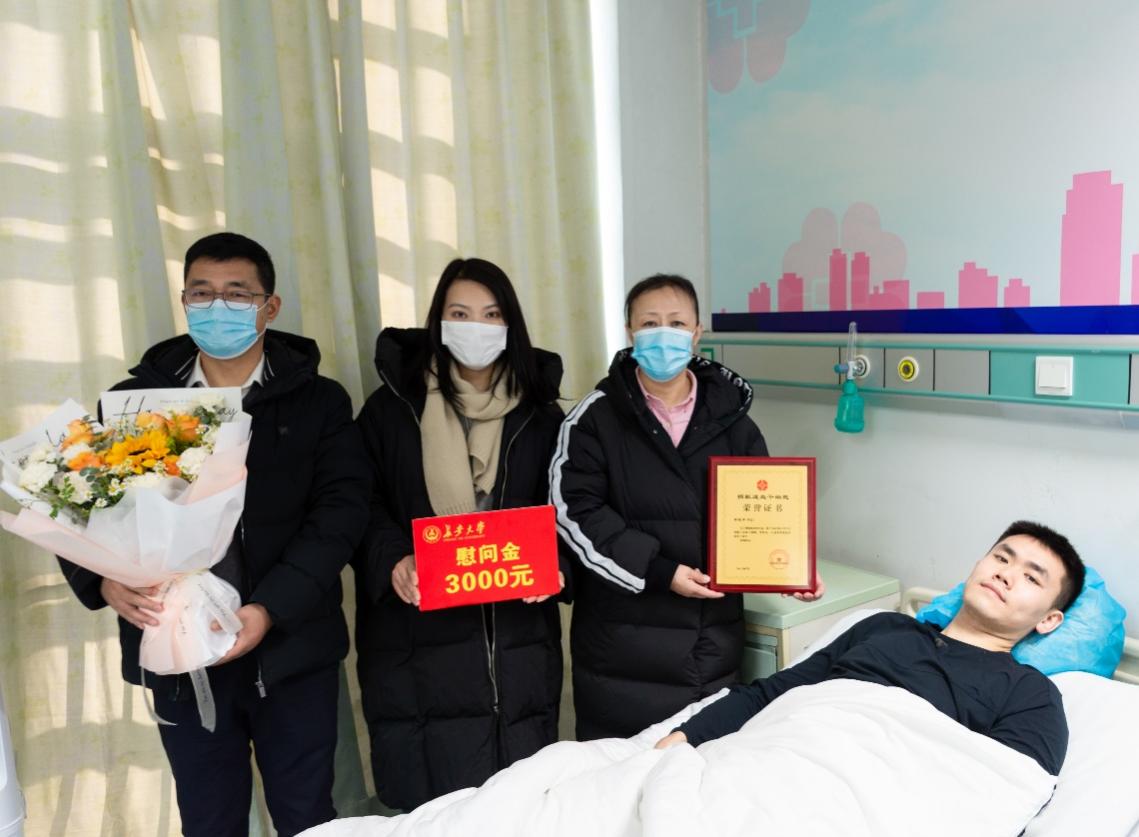 同日上午,校团委和巴黎人娱乐城 相关负责人一行前往唐都医院看望慰问了张凯军,对他乐于助人、无私奉献的高尚品质和爱心善举给予了高度赞扬和充分肯定,并代表巴黎人娱乐城 、巴黎人娱乐城 送上荣誉证书及慰问品。陕西省红十字协会相关负责人向张凯军同学颁发了“捐献造血干细胞”奖牌和“爱心使者”荣誉证书。