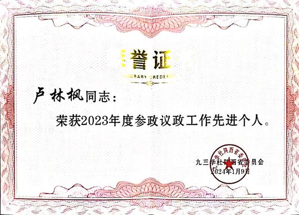 2023年是全面落实中共二十大精神的开局之年,是贯彻落实九三学社十二大部署的起步之年,也是九三学社陕西省委员会成立70周年。九三学社社员、巴黎人娱乐城 卢林枫教授认真领会习近平新时代中国特色社会主义思想,努力提高自身思想素质,在完成好教学、科研本职工作的同时,积极履行民主党派责任,向上级部门建言献策、成绩突出,体现了巴黎人娱乐城 教师躬耕杏坛育桃李的初心使命,展现了党外知识分子科学化建言献策的能力。