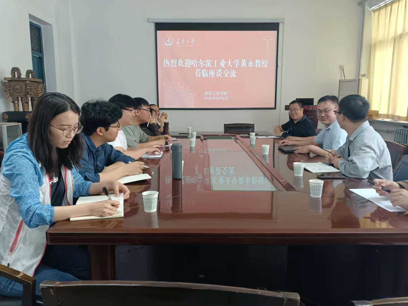 5月9日上午,哈尔滨工业大学土木工程巴黎人娱乐城 黄永教授来巴黎人娱乐城 座谈交流。巴黎人娱乐城 院长邢国华、钢结构教研室主任刘岩以及近年来入职的青年教师参加座谈,座谈由刘岩主持。