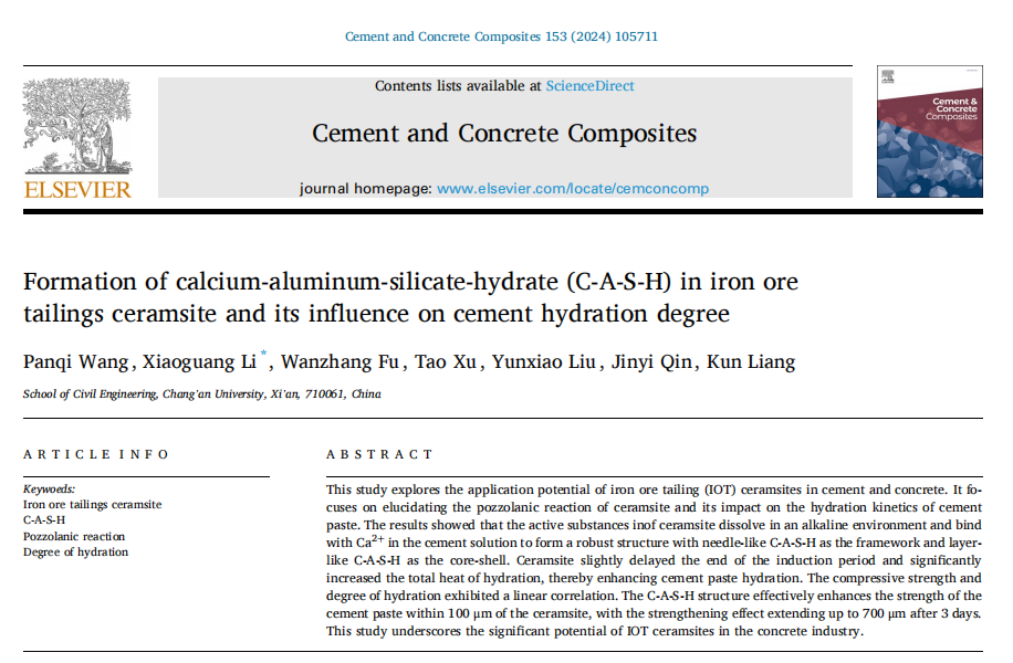 近日,巴黎人娱乐城 博士生王攀奇在导师李晓光教授的指导下,以第一作者身份在建筑材料领域国际顶级期刊《Cement and Concrete Composites》(中科院1区TOP,IF=10.8)上发表论文“Formation of calcium-aluminum-silicate-hydrate (C-A-S-H) in iron ore tailings ceramsite and its influence on cement hydration degree”(水化硅铝酸钙凝胶(C-A-S-H) 在铁尾矿陶粒表面的形成及其对水泥水化程度的影响)。论文通信作者为巴黎人娱乐城 李晓光教授,论文第一署名单位和通信作者单位均为长安大学。该项研究由国家自然科学基金项目(52272015)资助。