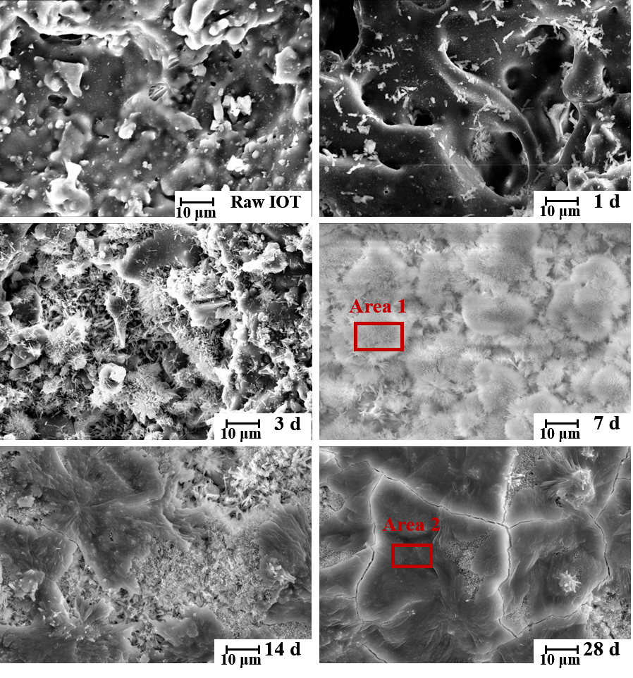 本文研究了铁尾矿陶粒在水泥和混凝土中的应用潜力。研究重点阐明了铁尾矿陶粒的火山灰反应及其对水泥浆体水化动力学的影响。结果表明,铁尾矿陶粒中的活性物质在碱性环境中溶解,并与水泥溶液中的Ca2+结合,形成以针状C-A-S-H为框架、层状C-A-S-H为核壳的稳固结构。铁尾矿陶粒的掺入可以推迟水泥诱导期的结束时间,并能够显著增加了总水化放热量。水泥硬化浆体的抗压强度与其水化程度具有线性关系。铁尾矿陶粒表面形成的C-A-S-H凝胶可以明显增强100 μm范围内的水泥石强度,且在3天后这一强化效果可扩展至700 μm。本研究为铁尾矿陶粒在混凝土行业中的应用提供了重要理论支撑。