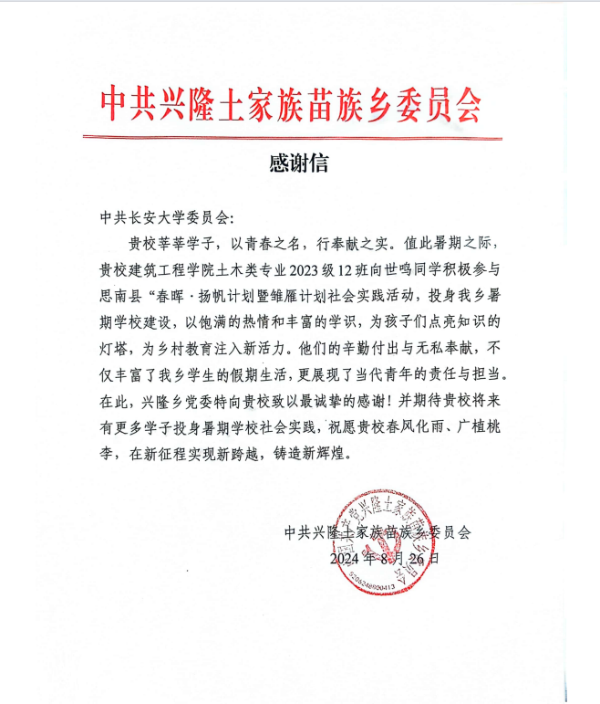 近日,建工巴黎人娱乐城 2023级土木工程专业本科生向世鸣,积极响应校院两级团委的号召,主动参加贵州省思南县“春晖·扬帆计划暨雏雁计划”暑期社会实践活动,为当地乡村教育做出了积极贡献。贵州省铜仁市思南县兴隆土家族苗族乡党委向长安大学致以感谢信,对向世鸣同学的积极表现给予高度评价。同时,共青团思南县委也积极关注并报道向世鸣的先进事迹。
