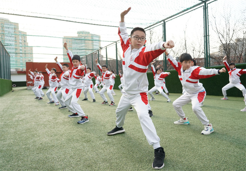 2024年2月21日,在人大附中实验小学,学生们在体育课中进行武术练习。(新华社记者 任超/摄)