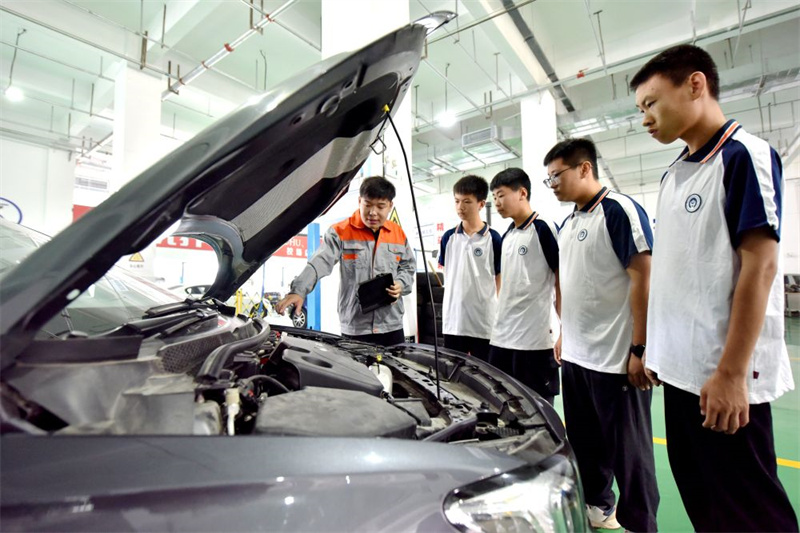 2024年6月7日,河北省邢台市威县职业技术教育中心教师在指导学生学习汽车维修技术。(新华社记者 王晓/摄)