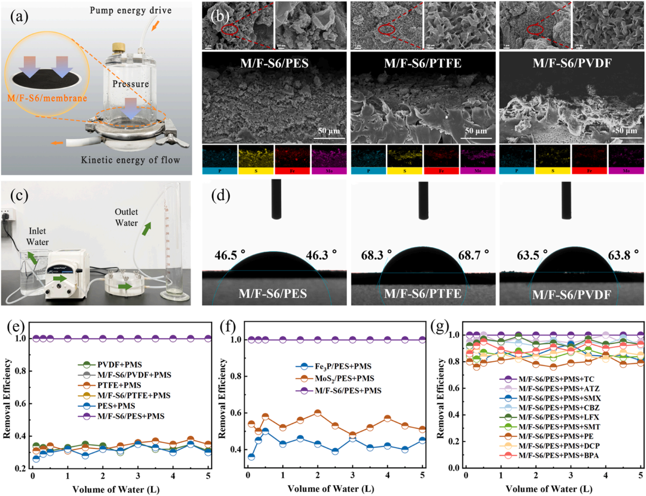 过硫酸盐(PMS)活化技术是高级氧化工艺的核心,在环境污染治理中备受关注。近年铁基材料(如硫化铁、四氧化三铁、磷化铁)凭借高活性、环保和经济优势成为研究热点,但铁基催化剂仍面临活性位点再生慢、自由基生成不足等瓶颈。目前,在铁基材料/PMS体系氧化降解新污染物过程中,二硫化钼是一种常见的性能良好的助催化剂,然而,关于硫空位(Svs)在二硫化钼中的浓度调控和定量作用的研究较少。该团队通过调控水热合成过程中硫脲浓度,合成了一系列有不同Svs含量的MoS2/Fe3P催化剂,研究了不同Svs含量的MoS2/Fe3P催化剂对类芬顿氧化体系中PMS的活性调节性能及反应机理。通过同步辐射、淬灭实验、电子顺磁共振及电化学分析等多种研究手段的协同应用,发现Svs含量最高的M/F-S6显著增强了非自由基途径(电子转移过程(ETP)、单线态氧(1O2)和高价铁活性物种(≡FeIV=O)),其催化PMS对污染物的降解效率提高了13.3倍。DFT计算证实Svs降低了电子传输能垒,提升了催化剂活性和稳定性。此外,M/F-S6在复杂水环境中表现出优异的催化性能、稳定性和可回收性,并在催化膜连续流处理系统中成功应用,展示了其在实际废水处理中的潜力。