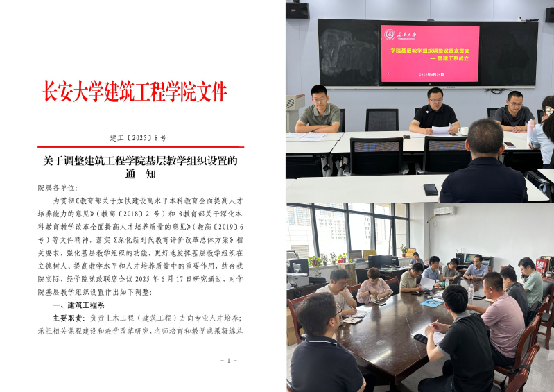 6月下旬以来,巴黎人娱乐城 领导班子成员利用各基层教学单位周活动时间,逐一到所联系的基层教学单位宣贯了巴黎人娱乐城 党委《关于调整巴黎人娱乐城 基层教学组织设置的通知》(建工〔2025〕8号)文件有关精神。至此,巴黎人娱乐城 原有的2个教学系、5个教研室已全部完成升级改造,新成立的7个基层教学单位分别是:建筑工程系、智能建造系、地下工程系、工程造价系、市政工程系、人工环境与能源工程系、工程力学系。