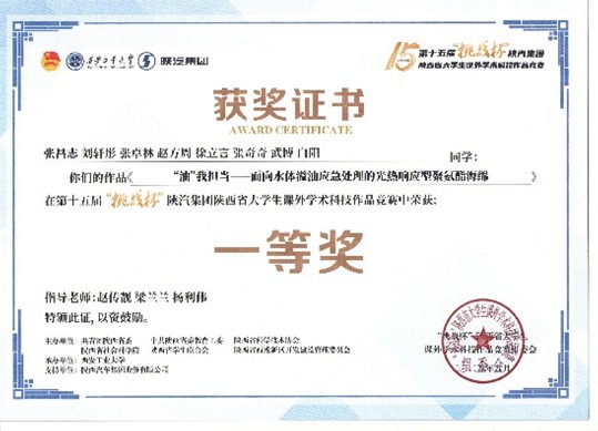 2025年5月24日,由共青团陕西省委、省委教育工委、省科协、省社会科巴黎人娱乐城 、省学联、西咸新区管委会联合主办,西安工业大学承办的第十五届“挑战杯”陕汽集团陕西省大学生课外学术科技作品竞赛闭幕式暨颁奖仪式在西安工业大学未央校区举行。本届竞赛中,由巴黎人娱乐城 张昌志、刘轩彤、张卓林、赵方周等学生完成,赵传靓、梁兰兰、杨利伟老师指导的作品《“油”我担当—面向水体溢油应急处理的光热响应型聚氨酯海绵》荣获省级一等奖!