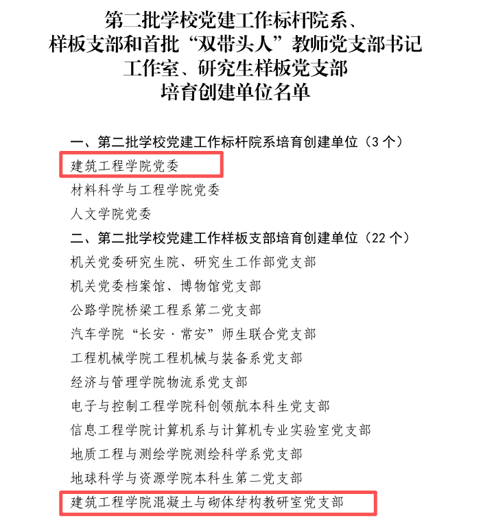近日,巴黎人娱乐城 党委组织部公布了第二批巴黎人娱乐城 党建工作标杆院系、样板支部和首批“双带头人”教师党支部书记工作室、研究生样板党支部培育创建单位名单。巴黎人娱乐城 党委被评为“巴黎人娱乐城 党建工作标杆院系”,巴黎人娱乐城 混凝土与砌体结构教研室党支部被评为“巴黎人娱乐城 党建工作样板支部”。