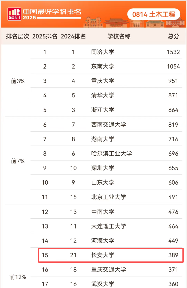 10月15日,著名高等教育评价机构——上海软科正式发布“2025软科中国最好学科排名”,全国共有167所设点高校参与土木工程学科排名,本次公布排名前50%高校(共计83所)。2025年,由巴黎人娱乐城 牵头建设的土木工程学科位列第15位,由2024年的第21位上升至第15位,稳居全国前12%。