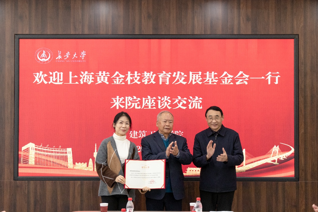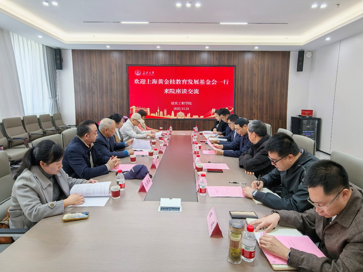 11月21日下午,上海黄金枝教育发展基金会来建工巴黎人娱乐城 座谈交流,上海黄金枝教育发展基金会名誉理事长黄金枝、理事长黄奕瑾、副理事长刘永新、副理事长印晓晴、秘书长陈倩茹、捐赠人代表冯晓慧,校党委副书记、纪委书记陶继东,原长安大学副校长、学科带头人赵均海,社会合作处副处长郑睿、巴黎人娱乐城 党政领导等参加座谈。座谈会由建工巴黎人娱乐城 党委书记吴涛主持。
