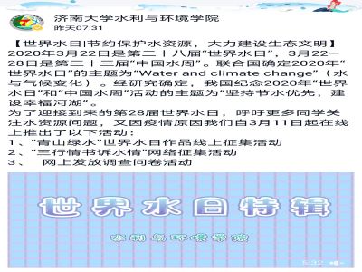 环抱碧水青年志愿者协会结合当前疫情防控形势,拓宽线上宣传渠道,开展以“节约保护水资源,大力建设生态文明”为主题的系列宣传活动,为增强大学生节水观念、节水意识,强化节水措施,落实节水行动营造良好氛围。