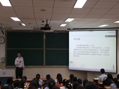 教育教学和人才培养模式改革的号召,是山东省首批实行学分制改革的高校之一。学分制是指学生取得的学分数作为衡量和计算学生学习量的基本单位,以达到基本毕业学分作为学生毕业主要标准的教学管理制度。随后,刘处长向同学们详细介绍取得学分的途径、选课、重修及考核、毕业和结业以及肄业和延长修业年限等。刘处长还为那些对第二专业比较感兴趣的同学们进行了简单的提议。最后,刘处长鼓励新生要热爱学习,激励同学们树立目标,以不同的方式学习,踏实奋进,为未来的工作就业打下坚实基础。