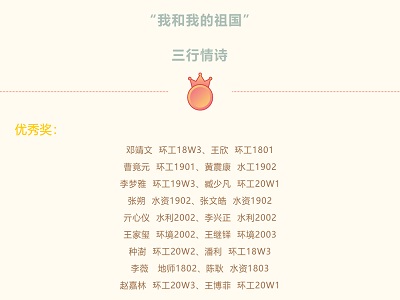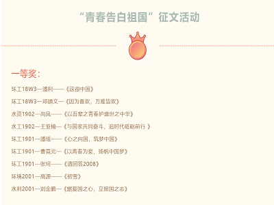 此次“逐梦青春,筑梦中国”表白祖国系列活动共分为两个板块,分别为“青春告白祖国”征文活动与“我和我的祖国”三行情诗活动。各参赛选手围绕“逐梦青春,筑梦中国”的主题,记录亲历、亲为、亲闻的真实故事,以小话题、小故事展现新时代下青年学生的责任担当和爱国精神。经过层层筛选、评比,在“青春告白祖国”征文活动中潘利等九位同学荣获一等奖,朱琳琳等16位同学荣获二等奖,姜艳鑫等20位同学荣获三等奖。同时邓靖文等18位同学在“我和我的祖国”三行情诗活动中荣获优秀奖。