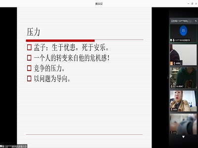 首先,郝书记强调提高能力素质是硬道理,紧扣“如何打造核心竞争力”这一主题提出竞争力=压力+动力+活力+合力。随后郝书记向同学们详细讲解了每个版块。在压力部分,郝书记强调一个人的转变来自危机感,所以同学们要坚持以问题为导向,要学会拥抱压力,乐观的面对压力。在动力部分,郝书记鼓励同学们在面对问题时要有动力,压力是动力,目标是动力,趋利避害也是动力。同时,郝书记告诫同学们要守住常识,守住初心。在活力部分,郝书记提出精神的活力是一种青春的象征,学生的自我教育是打开所有锁的钥匙,任何时候都不要限制自己的思维。精彩的生活来自不断地实践优化,在瓶颈期时要学会走出舒适圈,打破天花板。在合力部分,郝书记强调合作的重要性,合作是成员间的相互依赖,要避免完全的依赖他人和过度的自我独立。