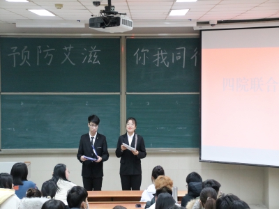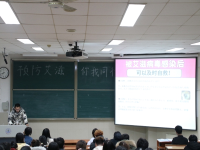 王潇等四名学生代表对艾滋病的定义、发展过程、感染条件、自救方式、传播途径等方面进行讲解,活动过程中还穿插着有奖问答环节,演讲过程中时而严肃,时而幽默诙谐,同学们积极参与,活动顺利进行。最后,在场同学共同观看了宣传纪录片。