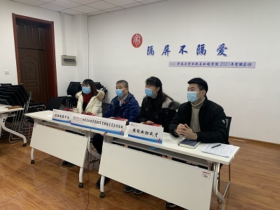 党委书记边健、院长徐征和、副书记张良红以及辅导员高蓉蓉、刘孟頔、张通组成的家访活动工作小组与张同学进行线上家访活动。