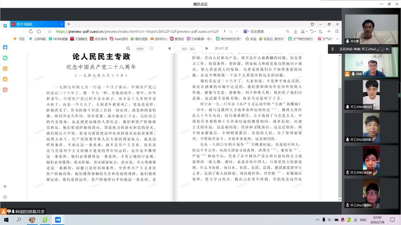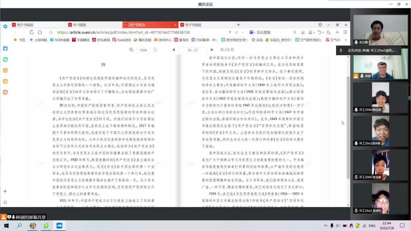 “青年党史研学社”暑期社会实践团队由指导老师白健和种澍、岳文卿、秦逢时、寇京航、李金蔚、臧少凡、李冰语、杨佳润、张心悦九名成员组成。此次实践活动旨在提高当代青年的科学文化素质,深刻学习党艰苦卓绝的发展历史。本次实践活动主要采取线上腾讯会议的方式进行,团队成员通过观看相关视频学习探讨党的发展历程,同时研究学习习近平谈治国理政、毛泽东选集、列宁选集、马克思恩格斯合集、共产党宣言、“九二共识”会谈记录等巴黎人娱乐城相关的文章和书籍,通过生动的文字更加深刻体会中国共产党党曲折而漫长探索之路。