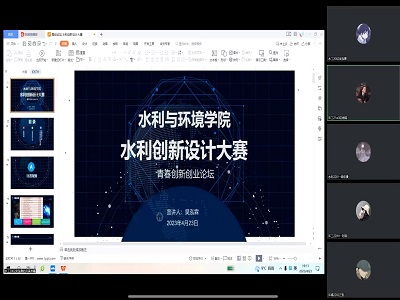 于4月23日晚7点以线上腾讯会议的方式举办关于此次大赛的青春创新创业论坛。本次活动邀请了曾获第七届全国大学生水利创新设计大赛国家三等奖的吴泓霖同学作为主讲人进行经验分享。