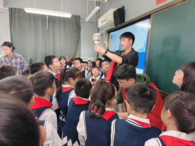 志愿者们以世界上水资源分配不均衡和“一水多用”的科普知识为重点,进行了细致的讲解,过程中小朋友们积极配合互动,现场十分活跃。随后,志愿者将同学们分成若干小组,分发实验素材,带领他们制作简易过滤水装置。小朋友们表现出极高的兴趣,认真听志愿者安排,积极配合、相互协作,与志愿者们共同完成滤水装置,也从实践中了解到净水的原理知识。整个宣讲过程气氛热烈,互动积极,同学们在轻松愉快的活动氛围中学习到了更多的水资源科学知识。