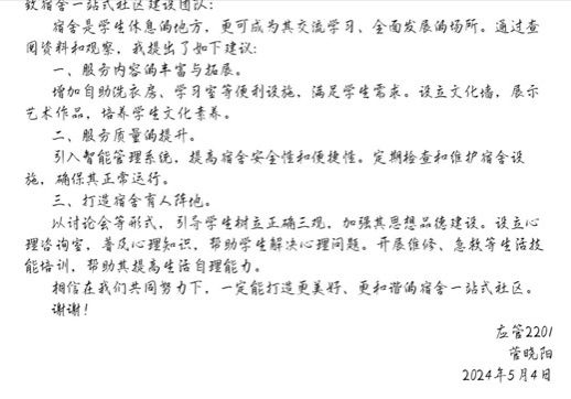 也表示,将认真考虑这些宝贵的建议,共同推动宿舍一站式社区建设的进程,期待未来的宿舍生活更加美好和便捷。