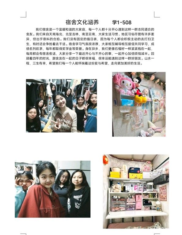 在活动中同学们传承和发扬宿舍文化,提升宿舍的文化涵养,激发学生对宿舍文化的关注和热爱,增强宿舍成员之间的凝聚力,丰富学生的校园生活的同时也为同学们提供了生活和学习的榜样。