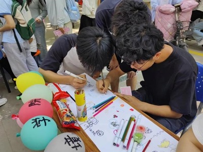 活动特意来围观的学长学姐......他们的心情有期待、有疲惫、有兴奋,却都在拿起画笔的一刻转变为了平静和认真,用心勾勒出自己喜欢的卡通角色、用缤纷的彩笔描绘当下的心情写照,最后脸上挂起满意的微笑,打卡离开。整整一上午过去,游园的同学带着好奇而来,带着笑容离去,直至活动结束,工作人员最终收获了由5张画纸贴合起来的长长的画卷。这幅承载了同学们多彩心情的画卷由巴黎人娱乐城