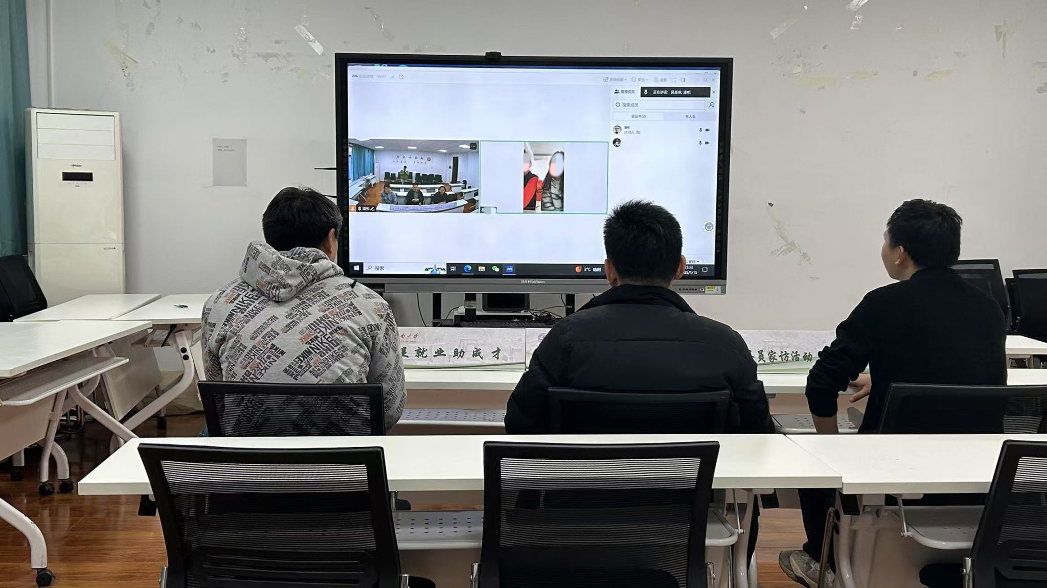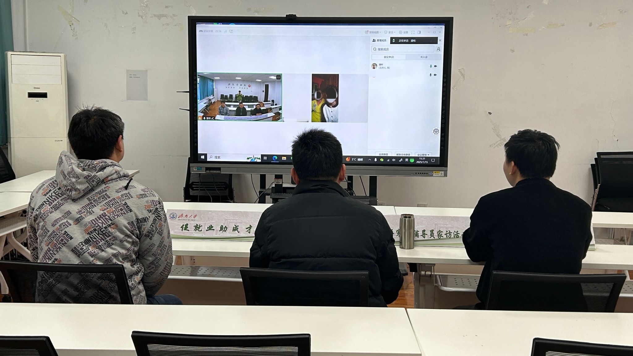 院长助理闫涛、环工2302班主任刘英豪、2023级辅导员潘彬组成家访活动小组,对2023级王同学和凯同学进行线上家访。