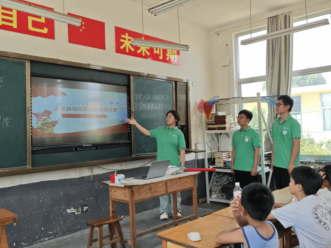 12日下午,团队在教室向村民开展 “地理视角下的沂蒙红色文化” 宣讲。活动伊始,以 PPT 阐述孟良崮战役胜利的地理因素。随后,分层讲解环节精准落地:为青少年播放动画短片、组织互动游戏,将地形对战役决策的影响转化为趣味故事,让红色历史浸润心灵;为成年村民分析地形在战役中的关键作用,结合乡村发展需求,探讨对现代旅游规划的启示及红色资源与地理环境的协同开发策略,让红色文化助力乡村振兴。