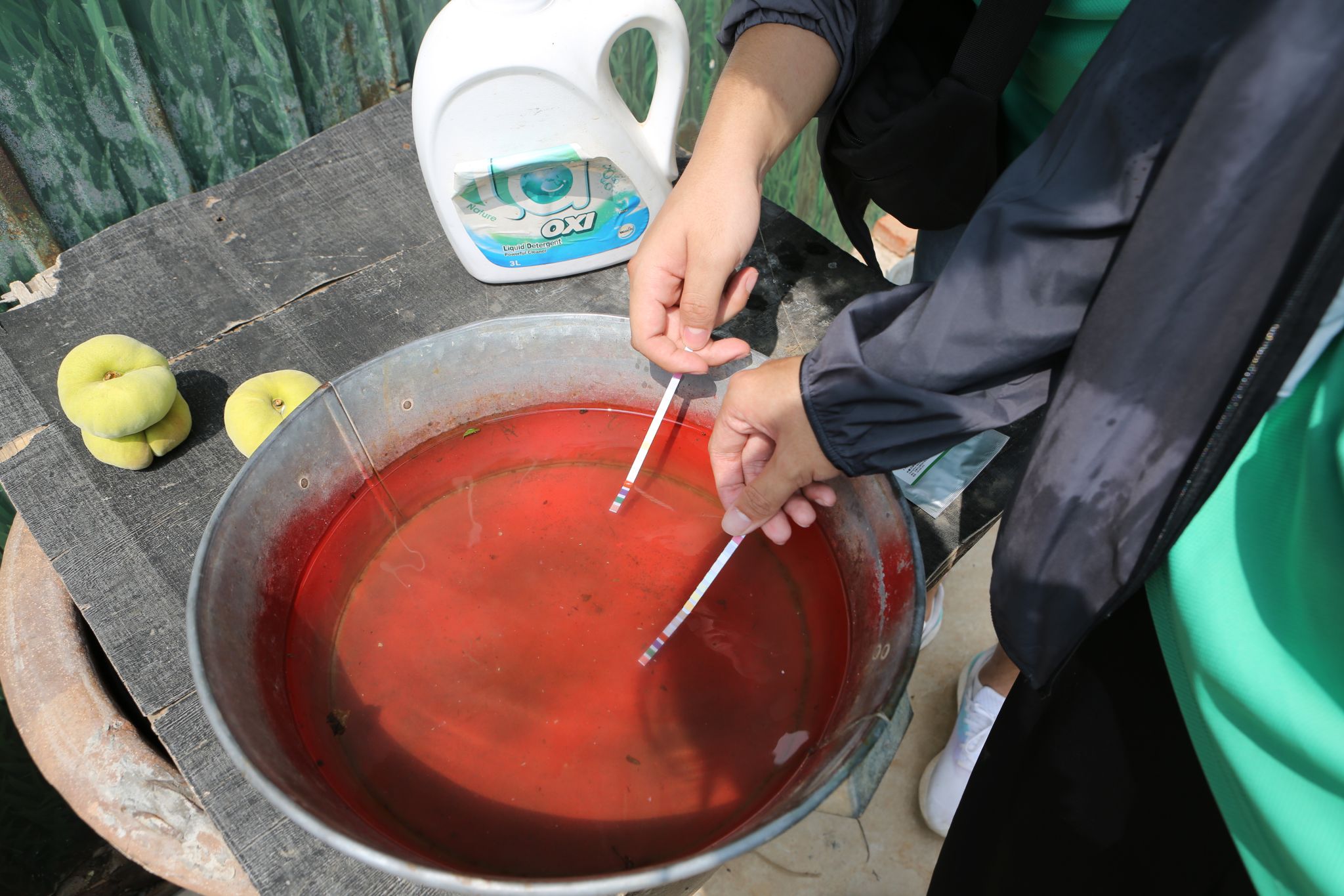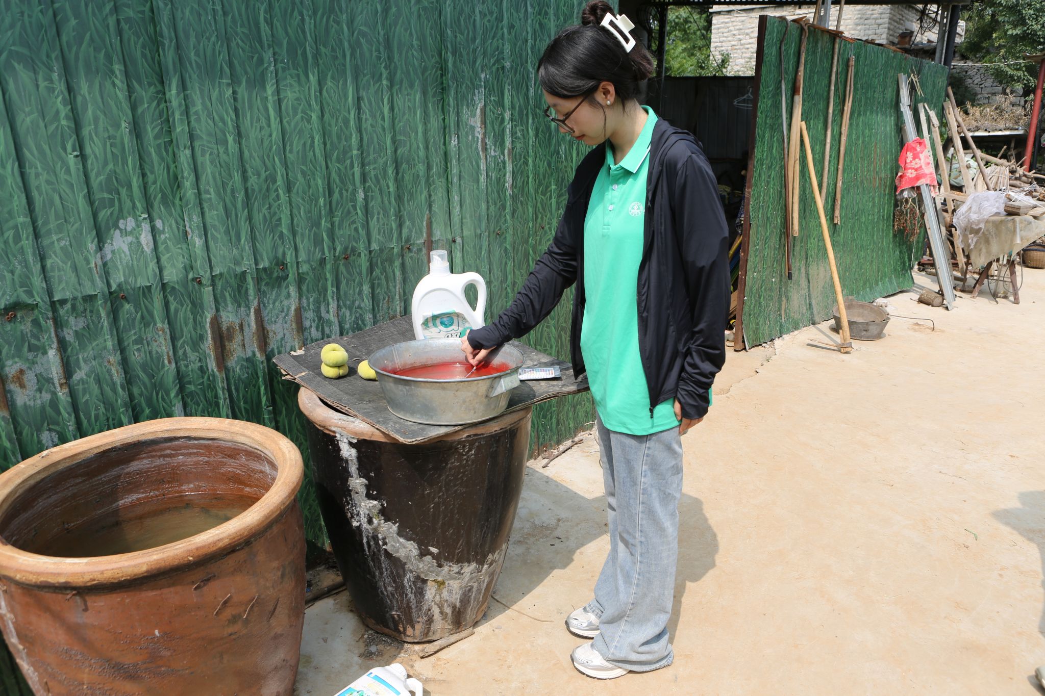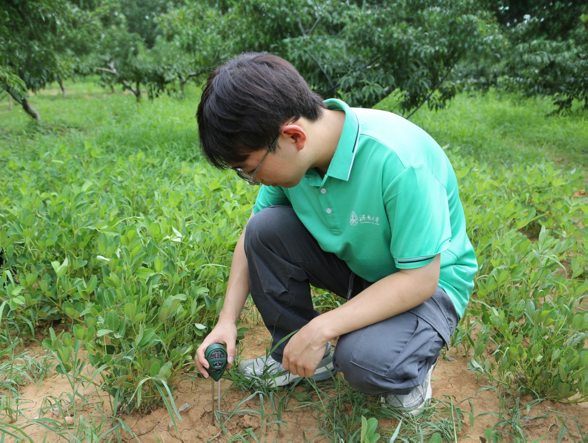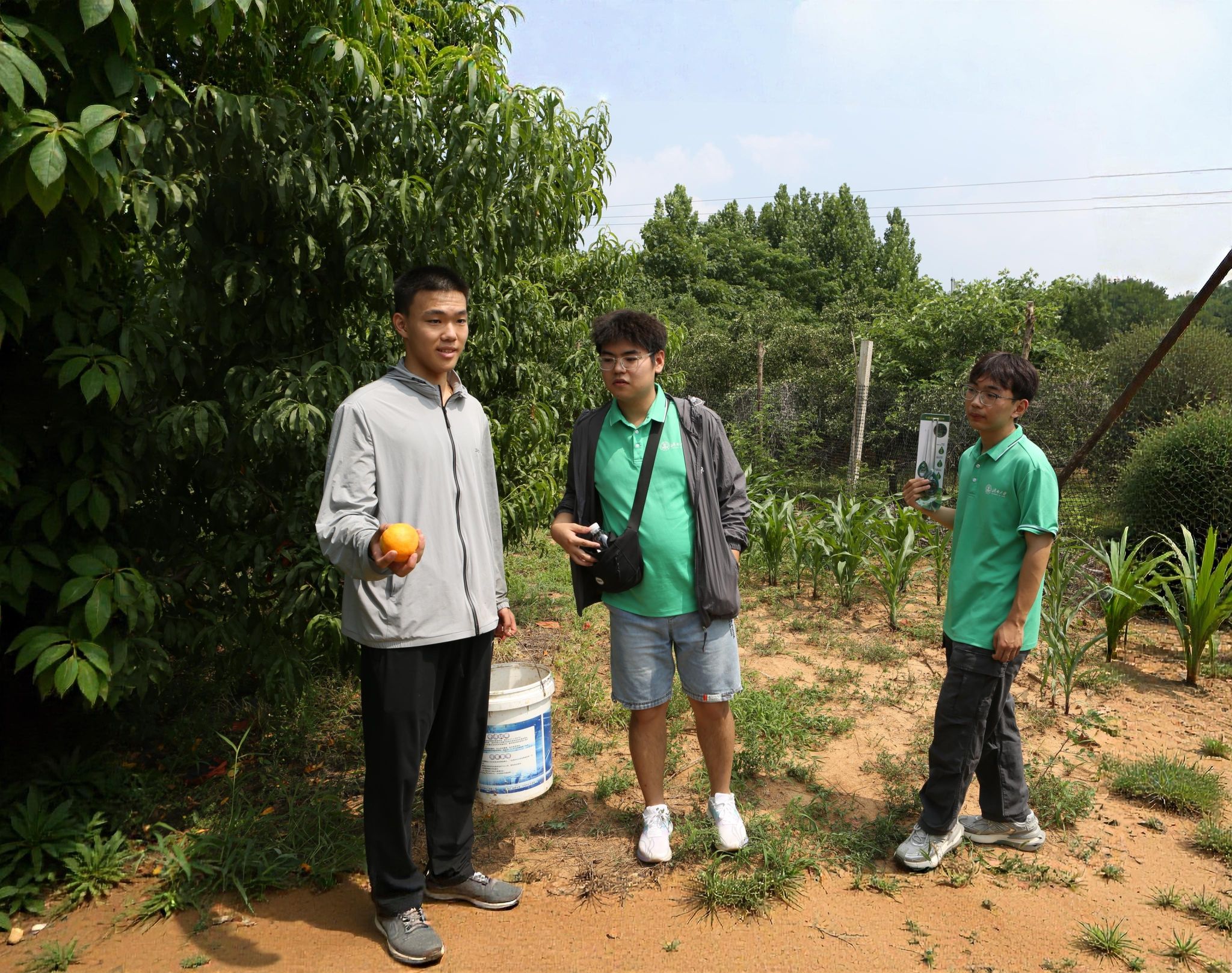 7月11日上午,团队成员分组深入桃园,通过现场观察与实地检测,全面了解该区域的土壤状况。检测结束后,团队及时整理分析所获信息与数据,分析了桃园土壤状况。当日下午,团队成员走访调查桃园的灌溉渠系,并对其灌溉用水进行检测。桃园负责人向团队成员解释了桃园内的滴灌技术的灌溉原理与作用。