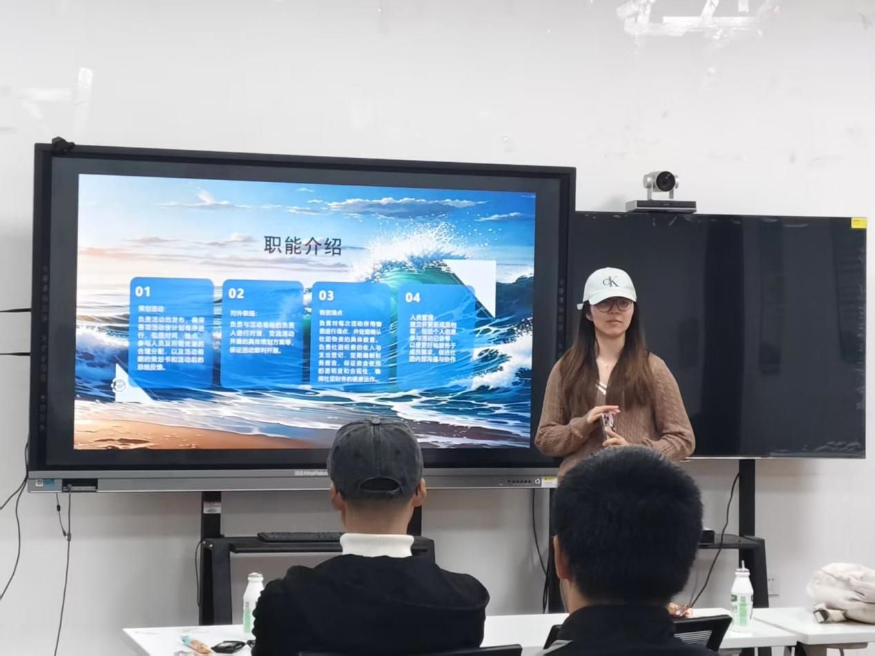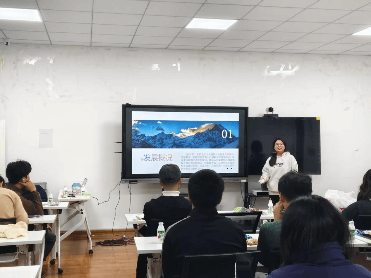 随后,社团四大职能部门负责人依次亮相,详解部门权责与协作机制。社团下设办公室、对外联络部、新闻组、环教讲师团四大部门,各部门功能明确且协同高效。办公室作为社团运营的“中枢大脑”,统筹活动策划、项目推进,同时负责物资清点与人员管理,保障各项事务高效运转;对外联络部化身“资源桥梁”,聚焦赞助洽谈与多方协调,为社团活动筹集资源、拓展对外交流渠道;新闻组担当社团“对外窗口”,以摄影摄像定格活动瞬间,通过新闻编辑输出优质宣传内容,传递环保正能量;环教讲师团则以“知识传播者”的身份,专注黄河保护录播课的组织与开展,用环教行动普及生态保护知识,助力黄河生态守护。
