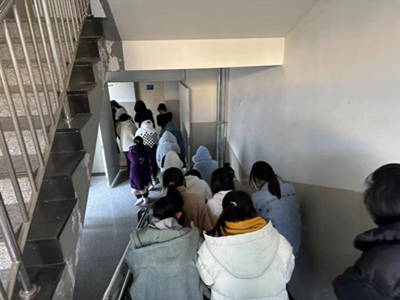 通过警笛与烟雾弹造势,模拟真实火情,整个场面充满了紧张的氛围,但学生们十分镇定,纷纷拿出湿毛巾,捂住口鼻,弯腰低姿,迅速且有序排成两列,按照演练要求既定路线有序疏散到指定地点。