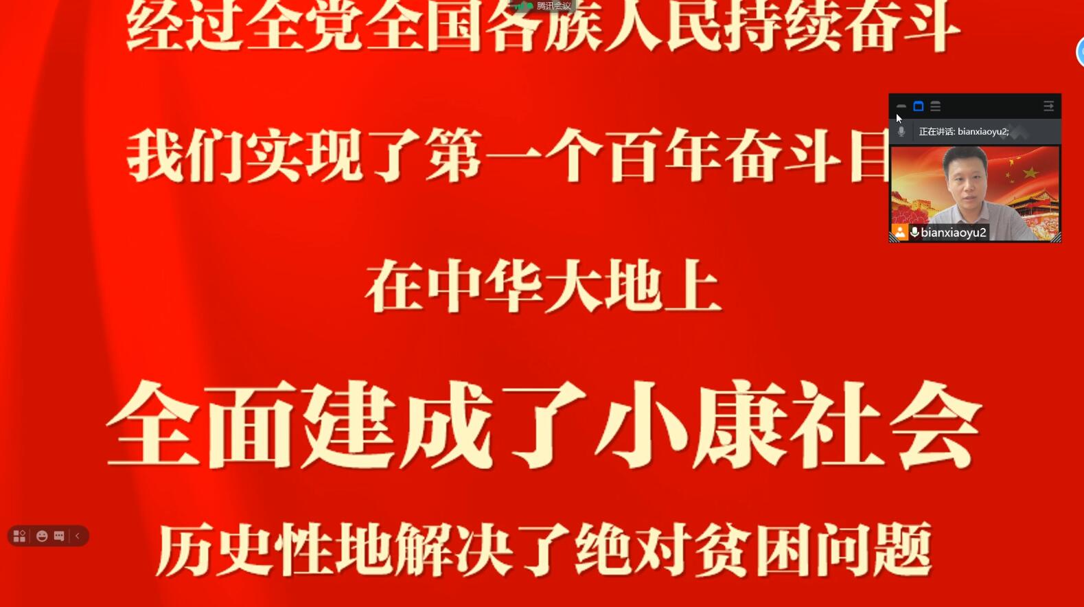 会上,边振同志带领全体党员同志重温了习近平总书记在庆祝建党100周年大会上的重要讲话内容,并围绕“一个百年目标、一个复兴主题、四个伟大成就、四个庄严宣告、一个伟大精神、九个必须”六方面深入总结了讲话精神。并指出,习近平总书记在庆祝大会上的重要讲话,深刻阐释了一百年来我们党团结带领中国人民走过的光辉历程、创造的伟大成就和取得的宝贵经验,庄严宣告了在中华大地上全面建成了小康社会,精辟概括了伟大建党精神,展望了中华民族伟大复兴的光明前景。习近平总书记的重要讲话,高屋建瓴、思想深刻、内涵丰富,具有很强的政治性、思想性、理论性,体现了深远的战略思维、强烈的历史担当、真挚的为民情怀,是一篇马克思主义的纲领性文献,为全党全国各族人民向第二个百年奋斗目标迈进指明了前进方向、提供了根本遵循。