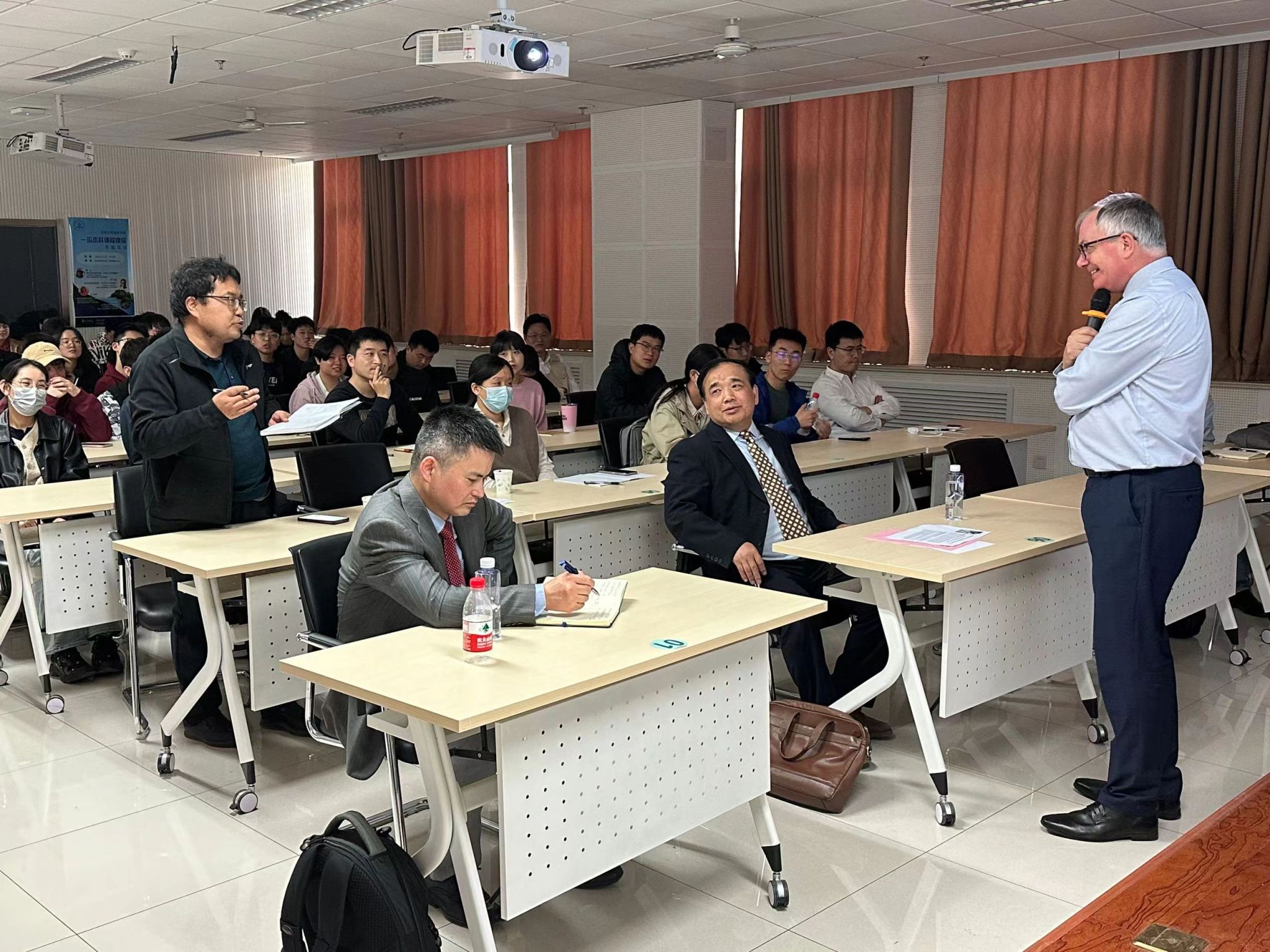 Trevor Hoey教授以“Predicting and Managing Flooding in the Tropics”(热带地区洪水的预测与管理)为主题,结合他在“改进菲律宾洪水风险评估”项目中的研究,就洪水预测与管理的重要性、研究方法以及未来发展方向进行了报告。针对菲律宾河流洪水频繁、带来的经济社会损失严重的问题,Trevor教授指出沉积物通量和地貌变化是菲律宾洪水风险的主要驱动因素。其次,详细介绍了洪水预测与管理研究的运作机制,包括利用FEH方法预测面积和日降雨量,结合新型激光雷达地形图对河道形态变化进行概化,并建立二维水流(HEC-RAS)与形态动力学模型来模拟河道水流泥沙,以探索河道防洪整治方案。最后,就热带地区洪水预测与管理存在的问题及改进方向进行了阐述。Trevor 教授的报告精彩纷呈,结束时赢得了师生们的热烈掌声。随后,师生代表纷纷举手提问,就报告中的专业问题展开了热烈讨论,现场气氛十分活跃。