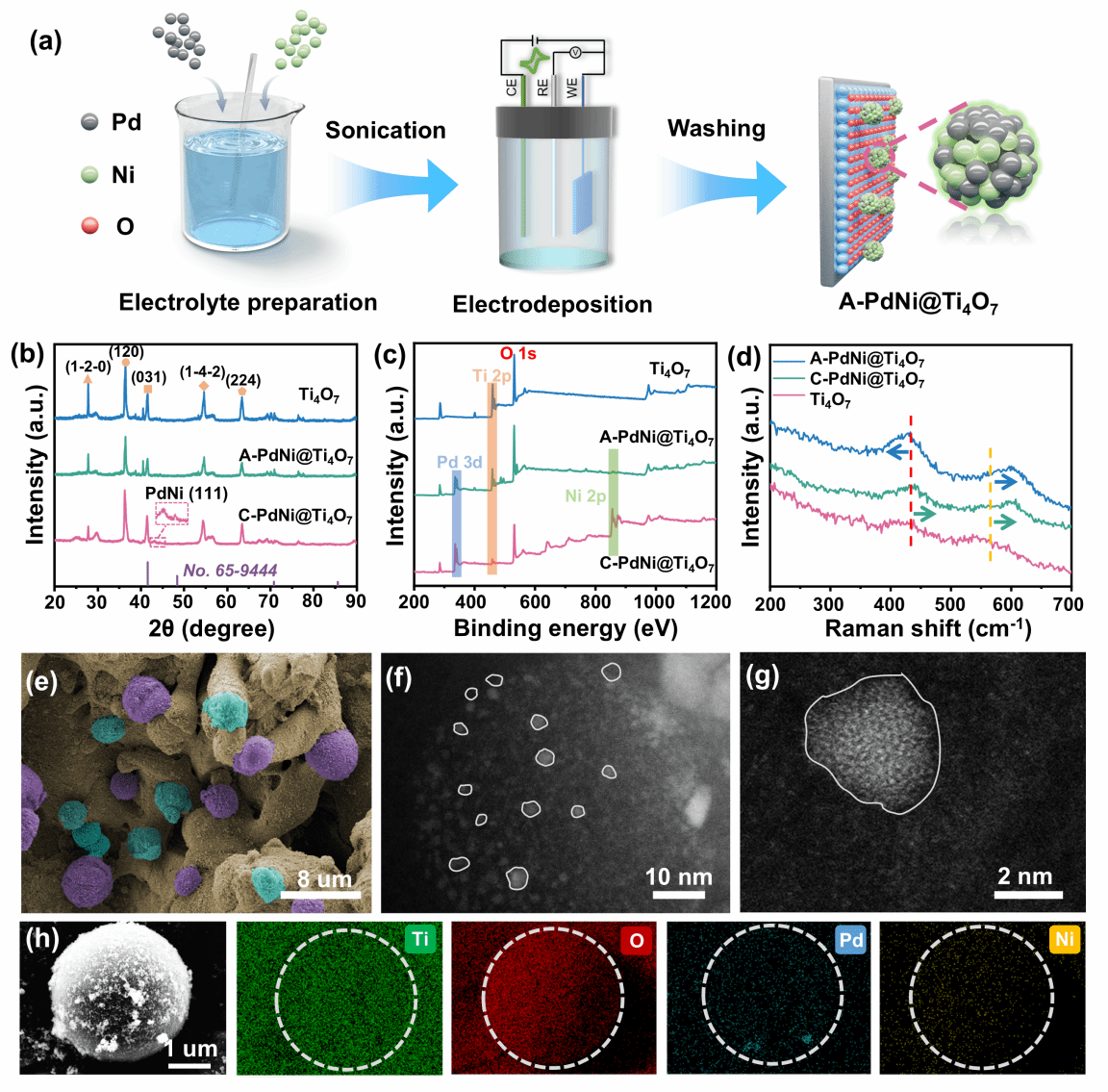 图1 A-PdNi@Ti4O7制备工艺流程及相应表征